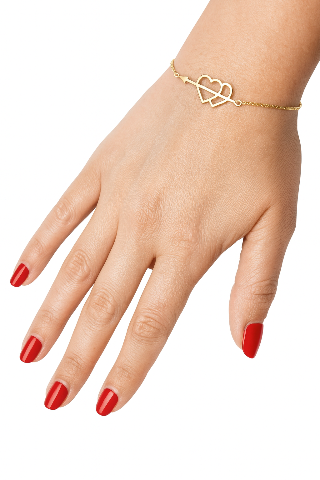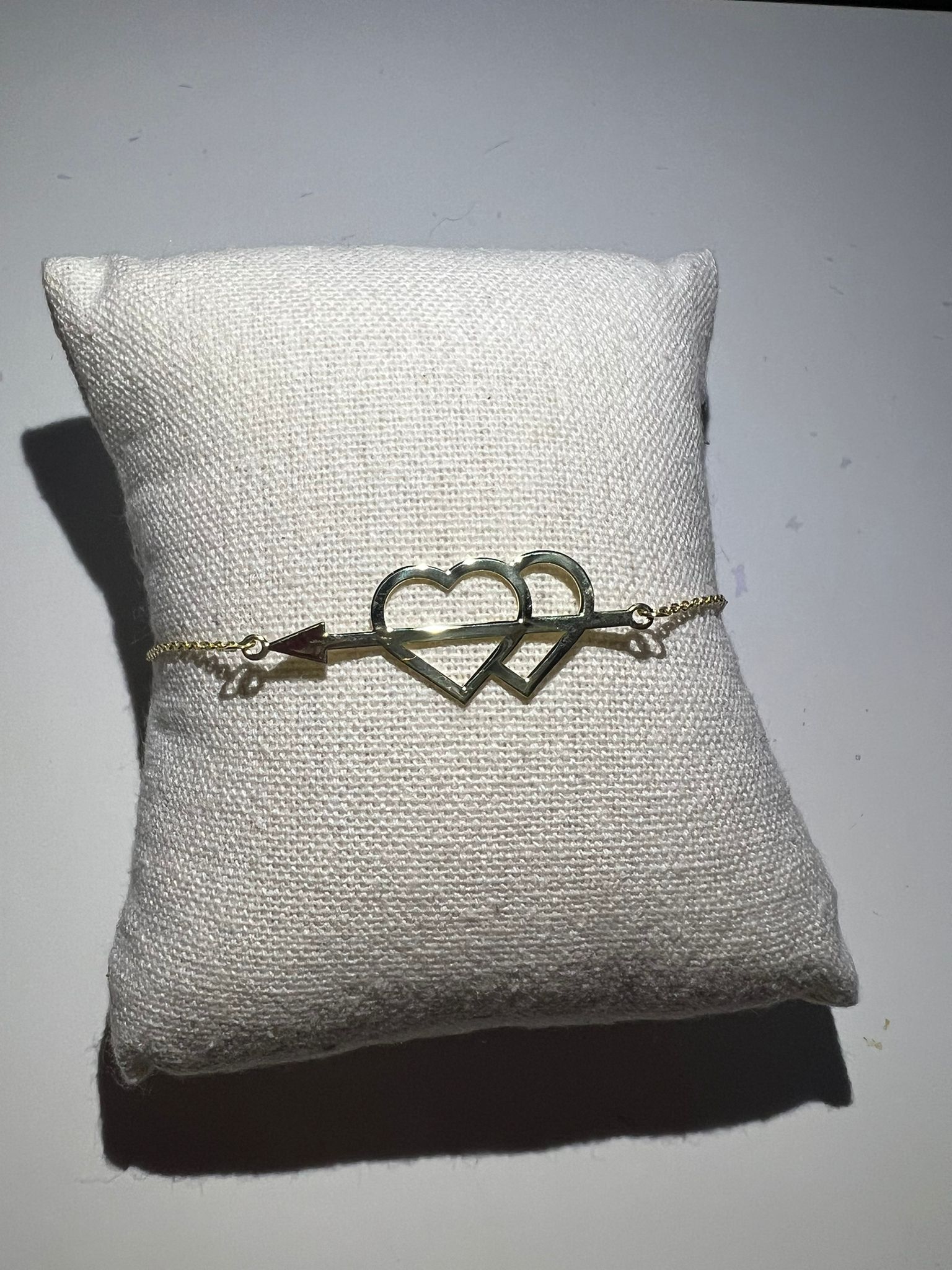 Ce bracelet raffiné orné d’un double cœur traversé d’une flèche. Sa chaîne fine et ajustable apporte une touche élégante au poignet, tandis que son motif romantique en fait un bijou parfait à offrir… ou à s’offrir.
